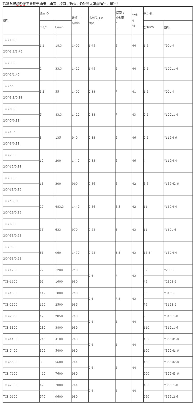 TCB齒輪泵流量:1.1m3/h-600m3/h壓力:0.28MPa--2.5MPa